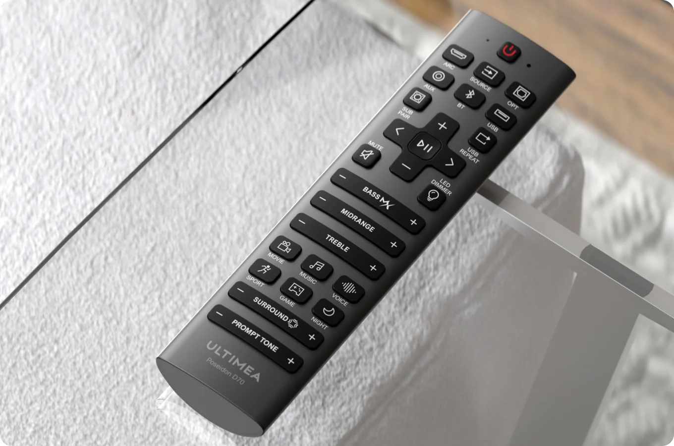 The Poseidon D70 7.1 Soundbar features three main channels for improved clarity and an expanded sound field.