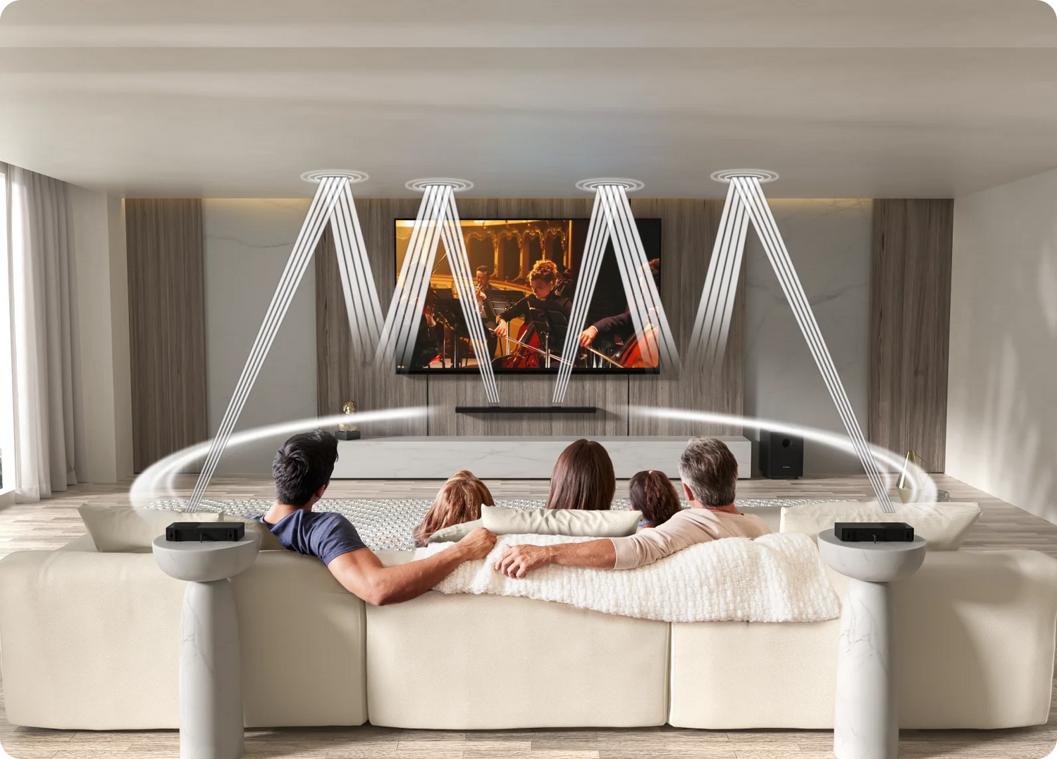 2 Wireless Up-firing Rear Speakersfor True Surround Sound
